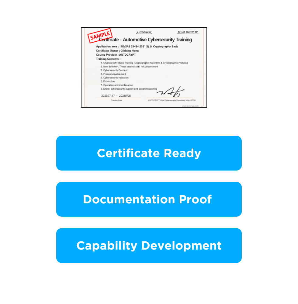 As a trusted leader in automotive cybersecurity, AUTOCRYPT provides training content aligned with global regulations, practical technical guides, and traceable certification programs to help organizations enhance their cybersecurity capabilities.