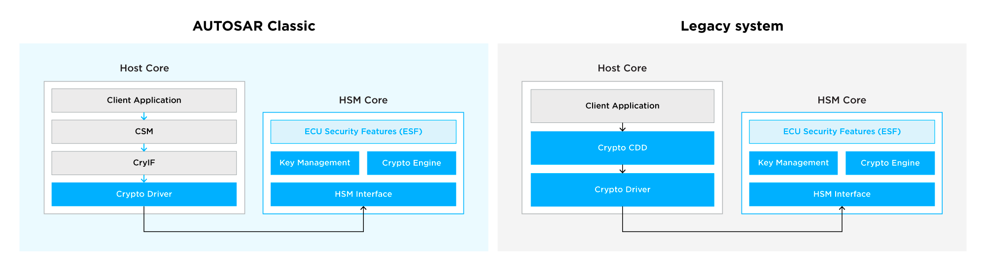 In legacy environments, it operates the Crypto Driver hardware via the Host Core’s Crypto CDD, enhancing data processing speed and optimizing vehicle controller performance.