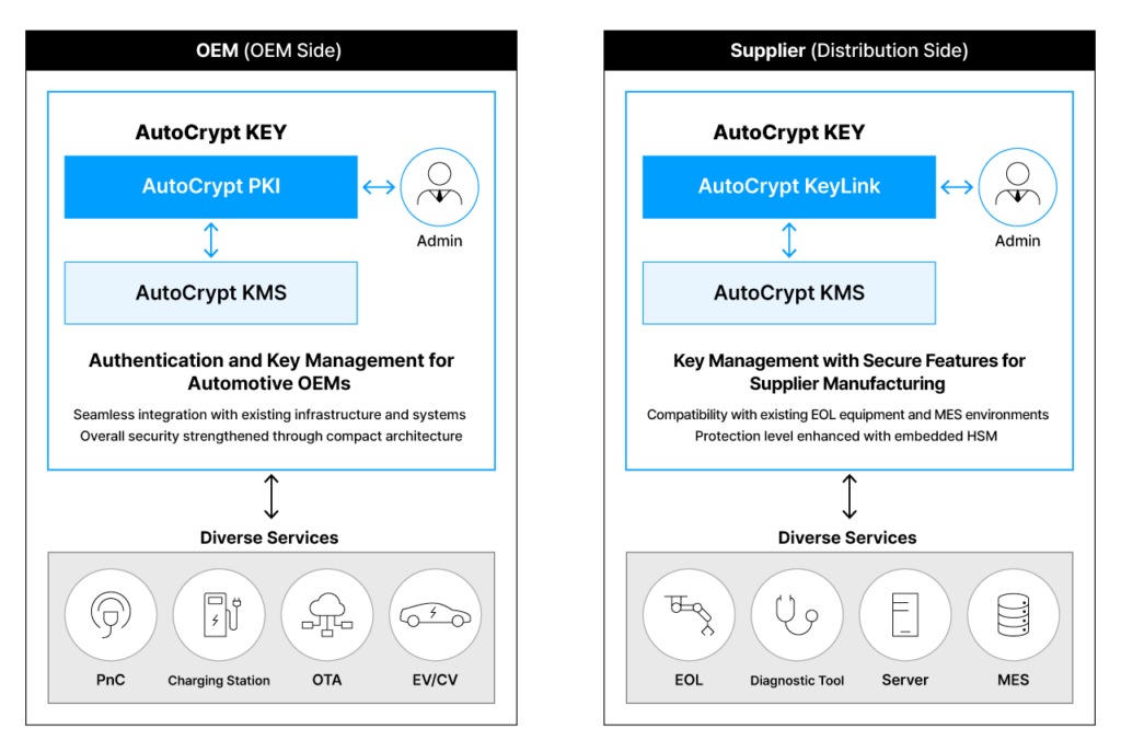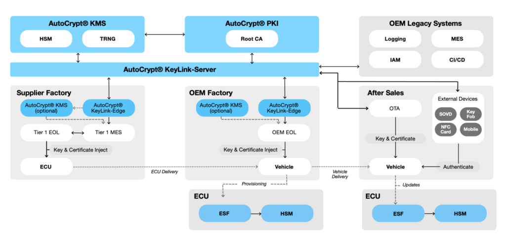 AutoCrypt® KeyLink enables secure key generation and distribution to vehicle ECUs through middleware integration within production environments. By verifying ECU data and serial numbers via manufacturing execution systems (MES), it prevents duplication and unauthorized provisioning.