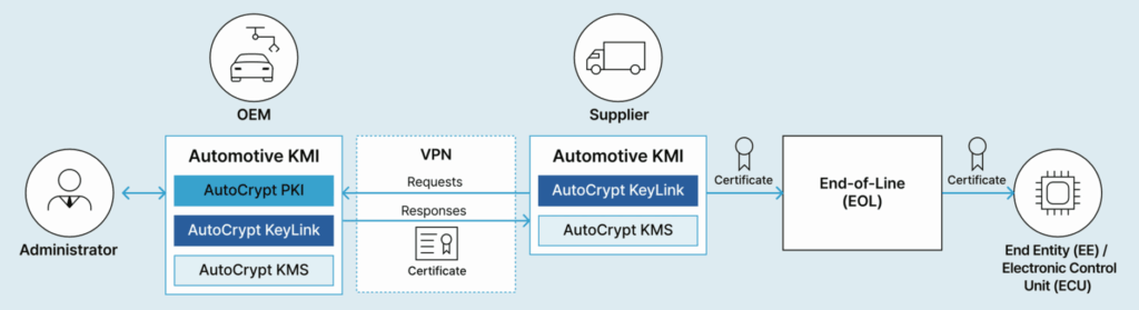 Automotive KMI enables end-to-end vehicle lifecycle security through a secure credential pipeline linking OEMs and suppliers. It orchestrates PKI and key management across diverse manufacturing environments, ensuring continuity of trust from vehicle production to in-field operation and long-term lifecycle governance.